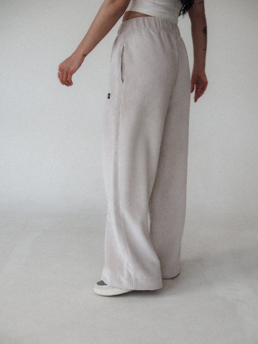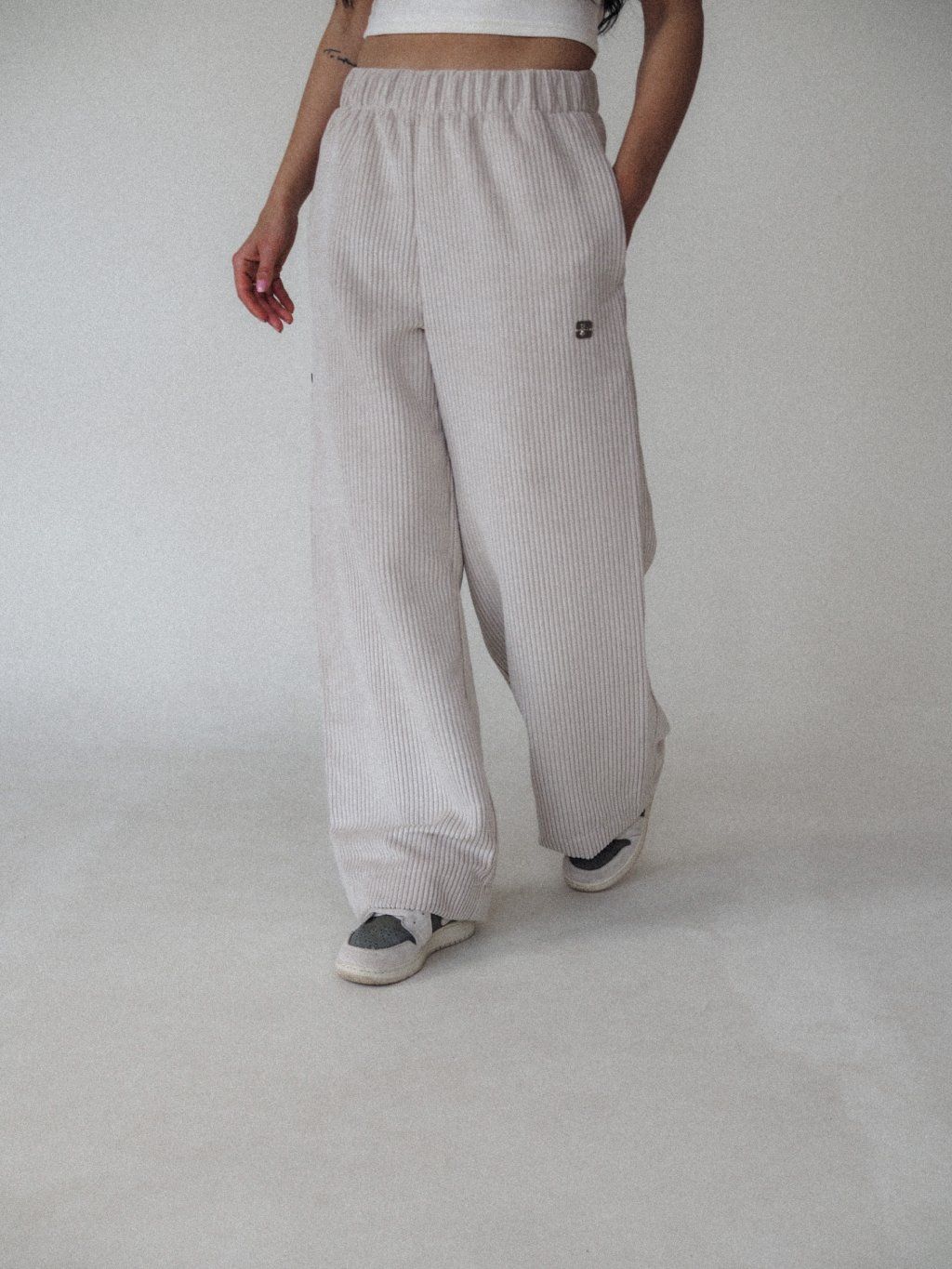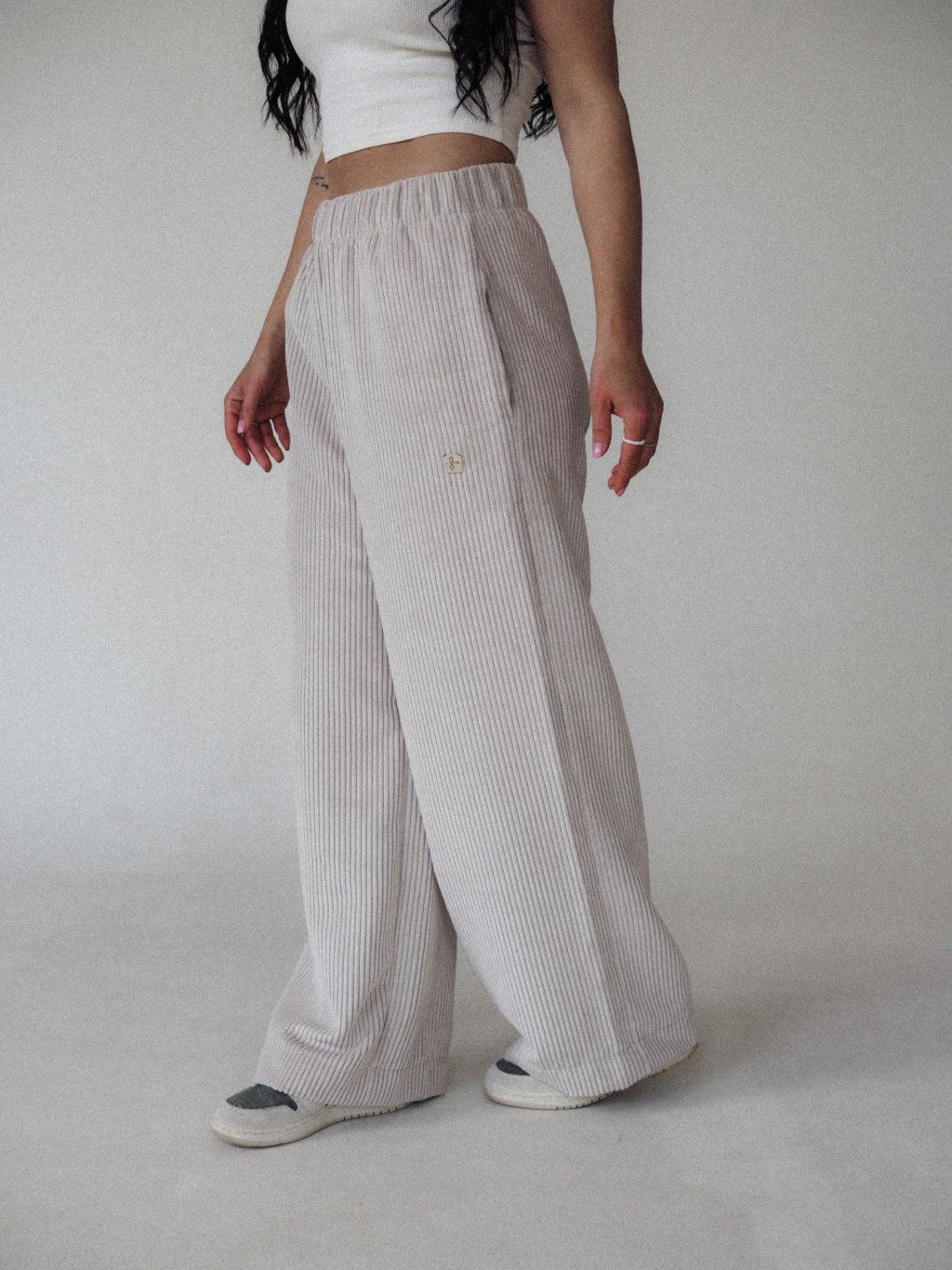 • Wide‑leg corduroy pants with an elastic waistband