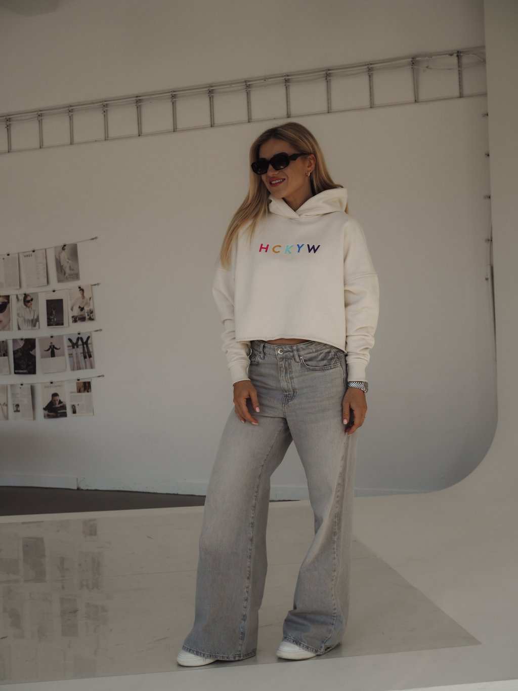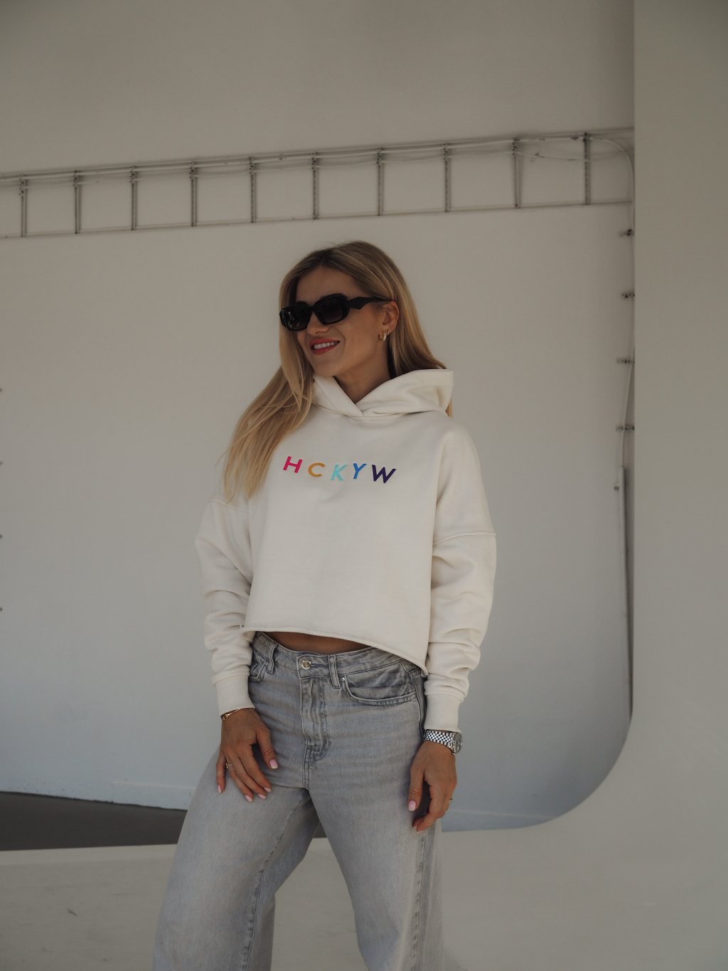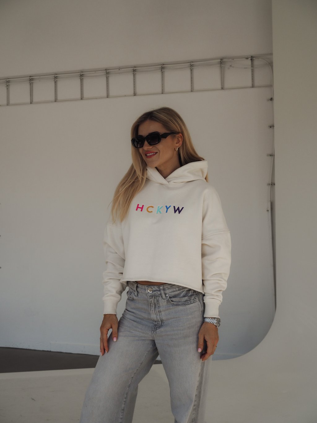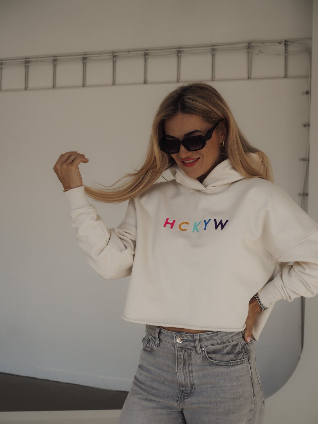 Krémová crop mikina s výšivkou HCKYW Stylový kousek s ikonickou výšivkou, který vznikl kompletně v Česku – od návrhu po poslední steh. Kromě materiálu, který máme od našeho řeckého dodavatele :)